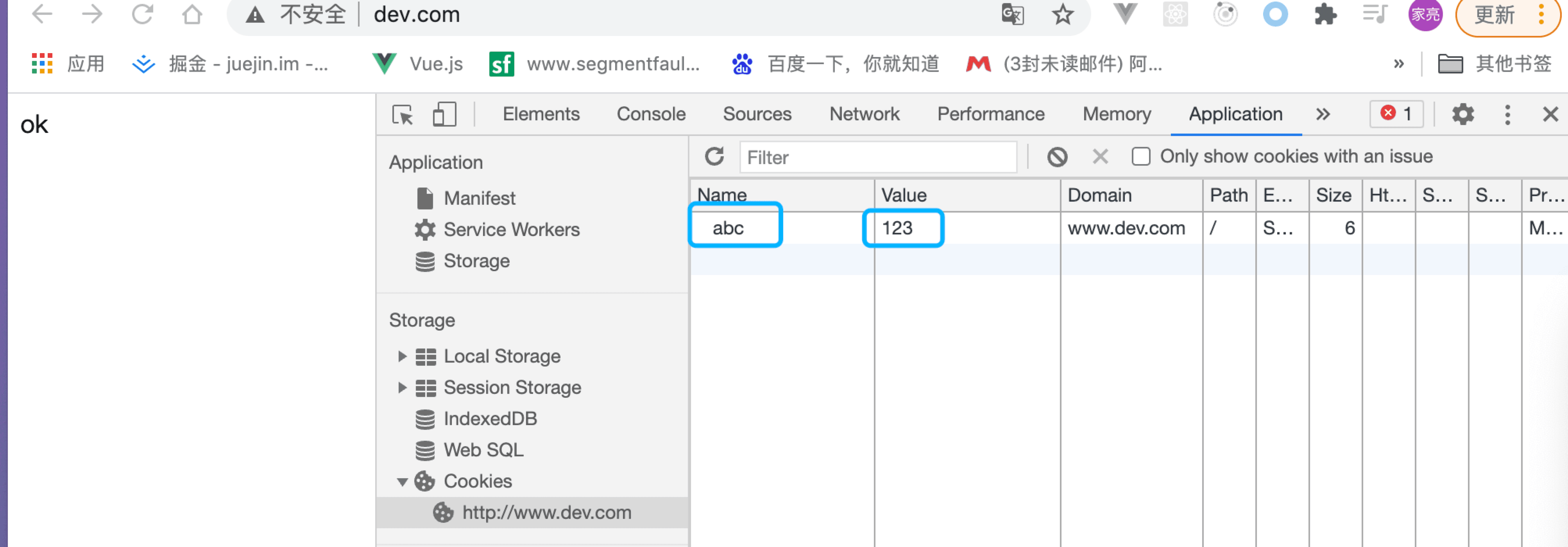 我们在chrome浏览器上访问http://www.dev.com/,就可以访问本地启动的3000端口的服务了,可以在Cookies里看见我们刚刚设置的cookie:apc=123; cookie也是受同源策略限制的,只有同域名下才能访问我们设置的cookie,如果没有设置失效时间,就会一直在。